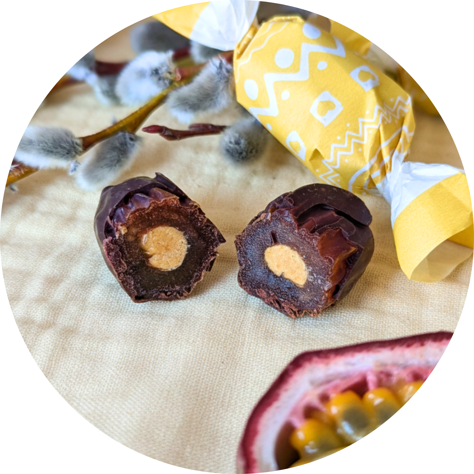 Ganze cremig-karamellige Medjool Datteln gefüllt mit 4 himmlischen Füllungen und umhüllt mit knackiger Schokolade aus 100% Kakao. Im Osternest versteckt sind die Sorten Maracuja Madness, Bomba di Pistacchio, Raspberry Cream und Nougat Crisp (jeweils 2 Stück). 8 Ostereier, 160g.