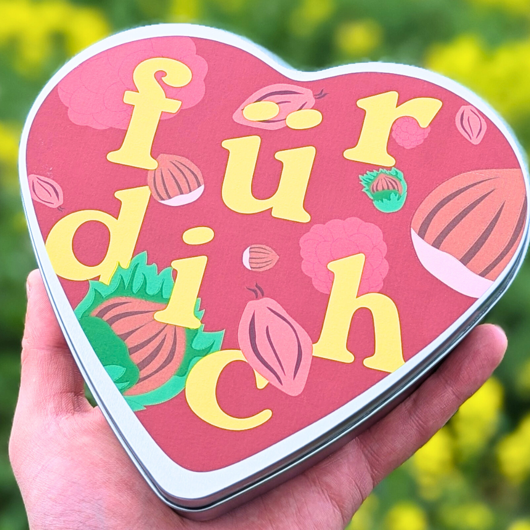 Wenn du die Schachtel öffnest, funkelt dir ein kleines Pralinen-Universum entgegen - fast zu schön zum Naschen. Unsere "Für Dich" Geschenkbox ist eine Hommage an die Freude des Schenkens und unsere allererste Pralinenbox, die nicht auf gefüllte Datteln setzt, sondern auf pure, handgemachte Pralinenkunst, die dein Herz zum Tanzen bringt. Gleich 24 Mal in 2 ganz neuen Sorten: Knusper Kuss – mit himmlischen Nougat und gefüllt mir einer ganzen Haselnuss – und Heiße Liebe – eine knallpinke Himbeer-Explosion.
