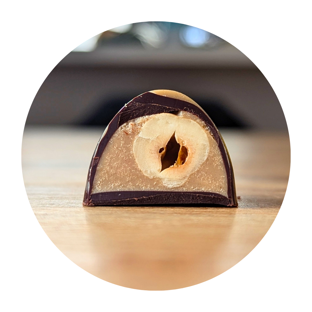 Der Nougat-Traum mit Biss. Cremig und knackig zugleich. Eine Praline für alle, die es nussig mögen.